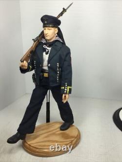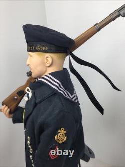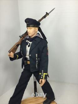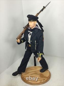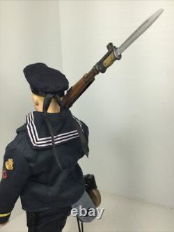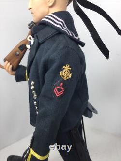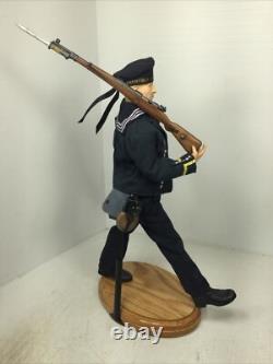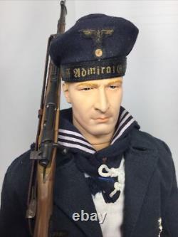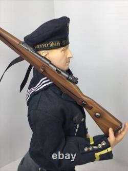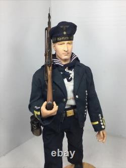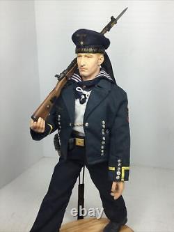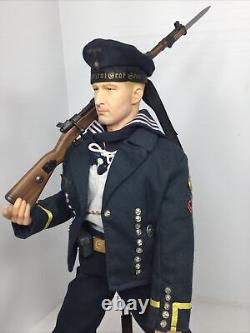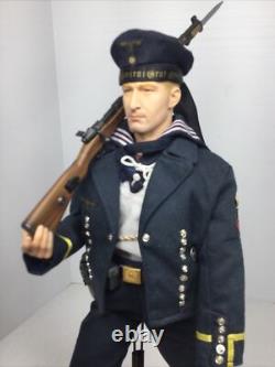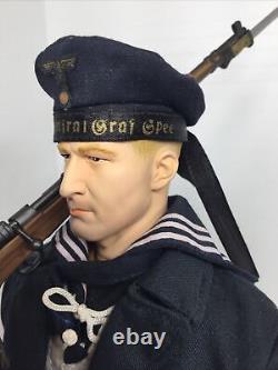 1/6 DRAGON WW2 GERMAN NAVY KRIEGSMARINE PETTY OFFICER 2ND CLASS POCKET BATTLESHIP "GRAF SPEE" IN PARADE UNIFORM! HE COMES WITH OAK AND METAL DISPLAY STAND FULL KRIEGSMARINE DRESS UNIFORM WITH RANK AND JOB PATCH SILVER WOUND BADGE AND SPANISH CROSS BADGE AND BREAST EAGLE KRIEGSMARINE CAP WITH GRAFF SPEE TALLY RIBBONS AND NATIONAL CAP BADGE BELL BOTTOM TROUSERS SHORT BOOTS BELT WITH METAL KRIEGSMARINE BUCKLE BAYONET SCABBARD BREAD BAG CANTEEN TWIN 3 CELL CARTRIDGE POUCHES WORKING BOLT MAUSER K-98 RIFLE WITH SLING AND REMOVABLE BAYONET ETC, ETC.