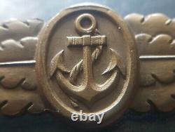 Naval Combat Clasp (German: Marine-Frontspange) was a World War II German military decoration awarded to officers and men of the Kriegsmarine in recognition of long, hard front line service for all naval units. On November 19th, 1944, Admiral Dönitz instituted the Marine Combat Clasp to be presented to Navy personnel for meritorious actions which were not covered by existing decorations. It was necessary to perform actions five times in excess of the requirements for a basic war badge. The badge was intended to be worn above the left pocket.