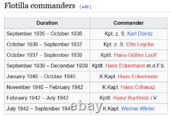 Weddigen, a U-boat commander during World War I, died on 18 March 1915 after his submarine U-29 was rammed by the British battleship HMS Dreadnought in the North Sea. The flotilla at first only consisted of U-9, a Type IIB boat commissioned on 21 August 1935. Later, boats U-1 to U-12 were included in the flotilla, but U-1 to U-6 were only used as training boats and were attached to the U-boat training school in Neustadt.Originally based in Kiel from September 1935 - May 1941, it was moved to Brest, France in June 1941. In September 1944, the flotilla was disbanded and its remaining boats were distributed to other flotillas.