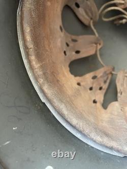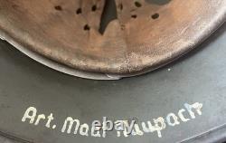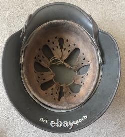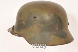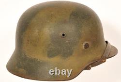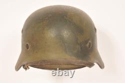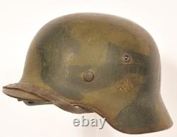 Original German named WW2 M35 Kriegsmarine Costal Artillery camouflage steel helmet. This is an SE made helmet for the KM. SE had the second KM contract that only was for M35 helmets, contract started pre war and ended in 1940, decal is the true gold KM type made be ET and used by both ET and as here SE. The helmet was a double decal, hand overpainted as per 1940 regs and then subsequently Camo painted for coastal artillery use.