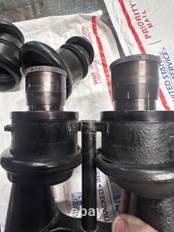 Nice original set of WW2 German u boat Kriegsmarine 7x50 wide angle Beh armored binoculars in their original German Navy Case. The lenses are dirty but the optics are in decent shape. Original rubberized armor and eye cup and lens guards. The case is military marked and in nice shape with the exception of the latch and hinge which are separated. A perfect addition for any military collection.