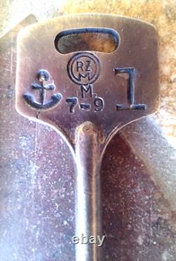 Very Rare solid WW2 brass key. War Navy is in German Kriegsmarine. M for Marine = Navy. Has a RZM symbol = Reichszeugmeisterei =Quartermaster's Office. The key age is; 80 - 90 years old.