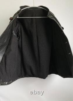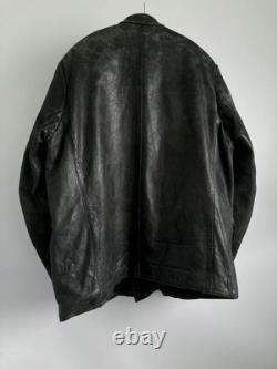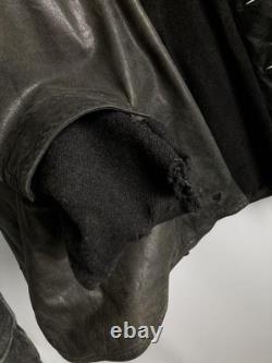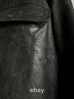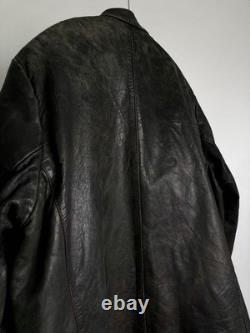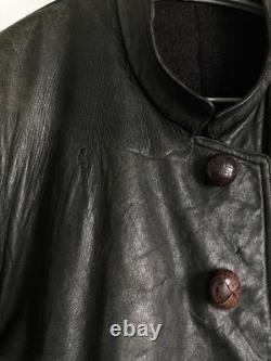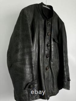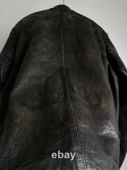 Offers a stylish, slim-fit silhouette with an A-line pattern and special shoulder tailoring. Made from soft, durable leather with a natural patina and subtle greenish-gray fade. Features discreet camouflage-like spray paint and markings that add to its historical character. ## Technical Specifications and Details. Shoulder width: 18.1 inches (46 cm). Bust width: 23.2 inches (59 cm). Length: 28.3 inches (72 cm) from neck to hem. Sleeve length: 24 inches (61 cm) from shoulder to cuff. Material: Leather (soft yet heavy appearance). Condition: Slight scratches and dirt present; various repairs and minor holes skillfully patched, including reinforcement of button areas, small holes with leather patches, and die repairs on interior pockets.Color: Not specified, presents a faded, greenish-gray hue with some camouflage spray paint markings. This jacket has been professionally repaired and maintained, with multiple minor holes and tears carefully patched or bonded to ensure durability. Personal inspection notes slight wear consistent with age, adding to its vintage appeal.